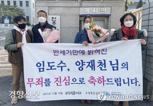 * 반공법을 위반한 혐의로 억울한 옥살이를 했던 2명의 어부에 대해, 15일 전주지법 군산지원에서 열린 재심 결과 무죄가 선고되자, 가족들이 환영현수막을 들고 있다.연합뉴스 제공