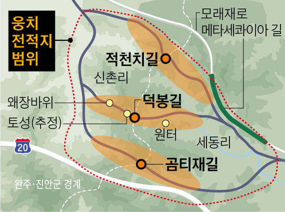 하 교수는 “웅치 일원의 세 고갯길 중 덕봉길 일대가 웅치전투의 주요 전장으로 추정된다”며 “이 지역에는 진친골·왜장바위 등 전투와 관련된 지명이 있고, 성터·서낭당·진지터와 전사한 군사들의 무덤으로 추정되는 지형이 분포하고 있다”고 밝혔다. 하 교수는 또 “실제 전투는 웅치 일원의 세 고개 전역에서 전개된 것으로 봐야 한다”고 덧붙였다. 실제로 『난중잡록』에서는 ‘왜군이 여러 부대로 나누어 들어와 싸우는데…’라며 전투가 폭넓게 전개됐음을 표현하고 있다.