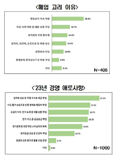 ‘가장 큰 경영 애로사항’을 묻는 질문에도 첫째, 임차료 상승 및 각종 수수료·세금 부담(21.1%), 둘째, 수입물가 상승으로 인한 원재료 매입비 부담(17.2%), 셋째, 고금리 지속, 만기도래 등 대출 상환 부담(16.7%), 전기·가스 등 공공요금 부담(16.3%) 순이었다. 언론들이 ‘허리가 휘고’ '곡소리 나고' ‘한숨이 나오고’ ‘패닉에 빠진다’는 최저임금 상승으로 인한 인건비 부담은 10.7% 응답으로 6번째 순위에 머물고 있다.