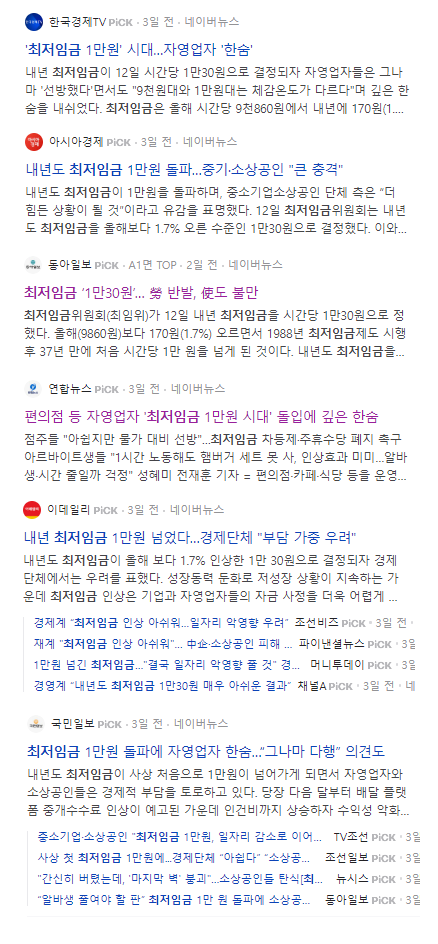 “정말 깜짝 놀랐죠...최저임금 1만원 돌파에 자영업자 패닉”(이데일리)이라는 선정적 제목의 기사도 보인다.